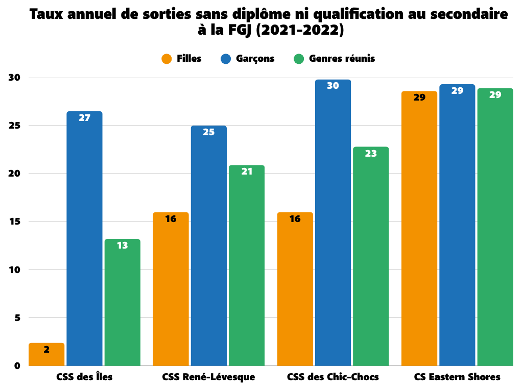 Les données en termes de décrochage scolaire pour les trois communautés Mi’gmaq du territoire ne sont malheureusement pas disponibles. À l’échelle du Québec, cependant, on note que le taux annuel de décrochage est très élevé dans les trois centres de services scolaires à statut particulier, là où l’on trouve une grande partie des élèves autochtones (CS Kativik, CS Crie et CSS du Littoral). En 2021-2022, ces taux étaient respectivement de 64,8 %, 72,0 % et 14,6 % pour les genres réunis [9]. Les réalités des trois communautés Mi’gmaw de la région sont aussi très différentes. De nombreux élèves Mi’gmaw fréquentent des écoles du CSS René-Lévesque, du CSS des Chic-Chocs et de la CS Eastern Shores, alors que d’autres fréquentent des écoles de communautés ou du Nouveau-Brunswick, ce qui rend difficile le suivi de leur cheminement scolaire.