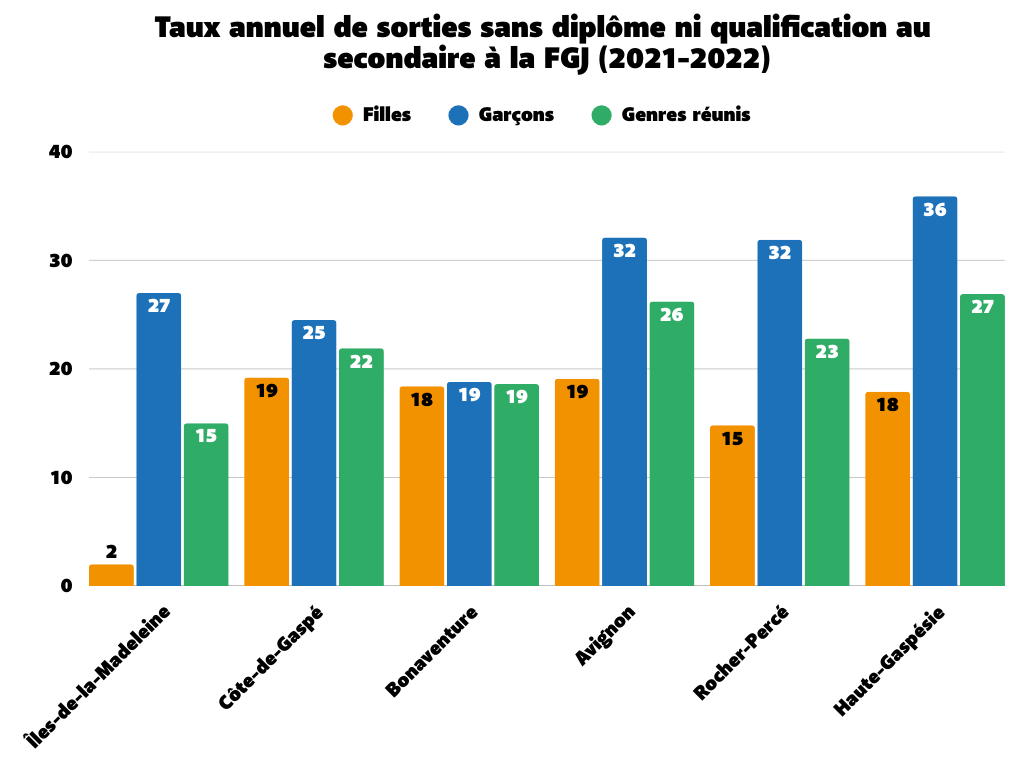 L’écart le plus grand entre le décrochage des filles et des garçons est observé aux Îles-de-la-Madeleine (25 points) alors que le plus faible est celui de la MRC de Bonaventure (0,4 points), où les taux de décrochage scolaire oscillent autour de 19 %. Sans surprise, c’est dans les trois MRC les plus dévitalisées de la région qu’on observe les taux de décrochage scolaire les plus élevés.