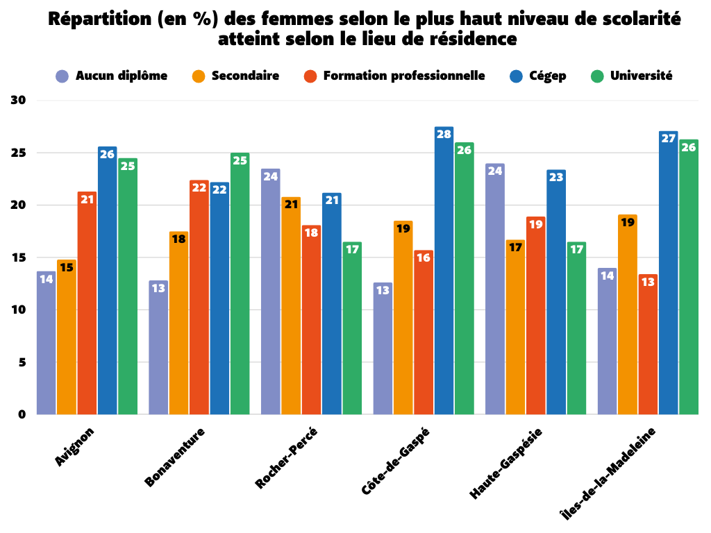 En 2021, le niveau de scolarité le plus souvent atteint par les femmes de la région âgées de 25 à 54 ans était le niveau collégial, les femmes étaient proportionnellement plus nombreuses (>24 %) à ne détenir aucun diplôme dans les MRC du Rocher-Percé et de la Haute-Gaspésie, et c’est dans la Côte-de-Gaspé où les femmes sont le plus scolarisées avec un taux de diplomation postsecondaire de 70 % [17].
