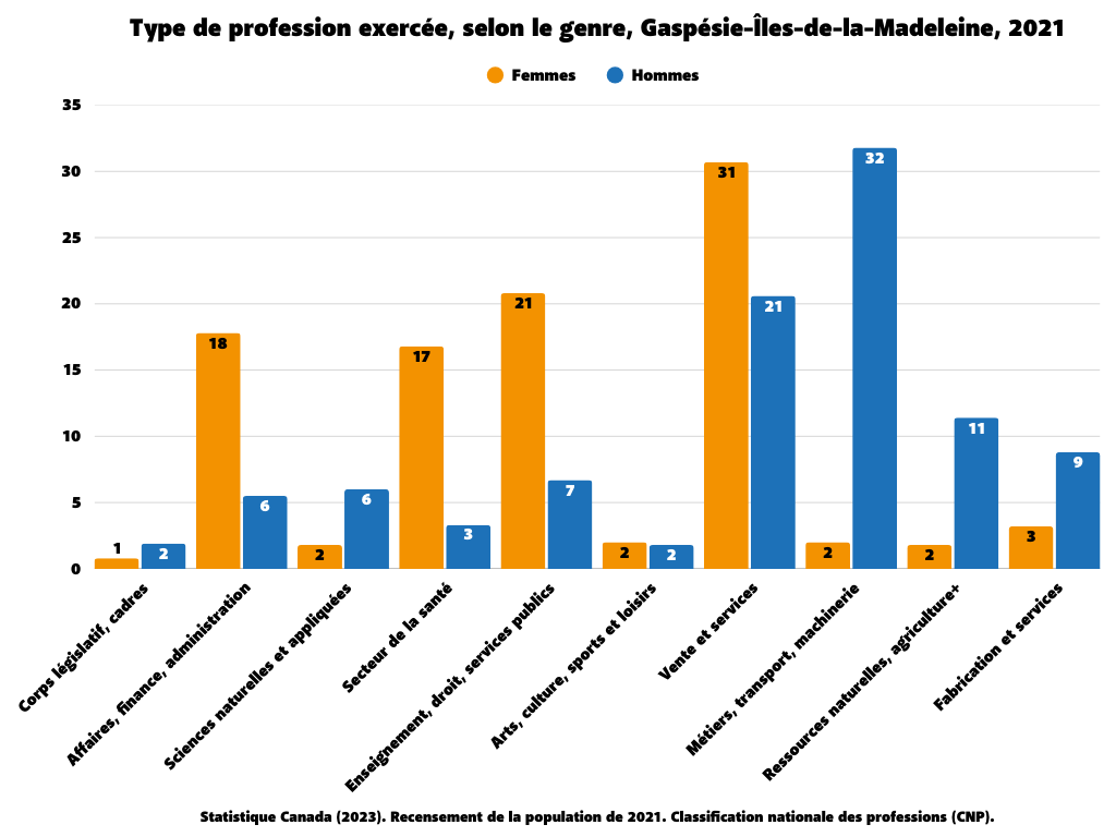 D’après les résultats du recensement de 2021, les femmes de la région sont plus nombreuses que les hommes dans les professions traditionnellement féminines que sont les « domaines de la vente et des services (30,7 % contre 20,6 %), des affaires, de la finance et de l’administration (17,8 % contre 5,5 %) ainsi que de l’enseignement, du droit et des services sociaux, communautaires et gouvernementaux (20,8 % contre 6,7 %). […] Elles sont aussi plus concentrées dans les professions liées au domaine du secteur de la santé (16,8 % contre 3,3 %) [23] ».