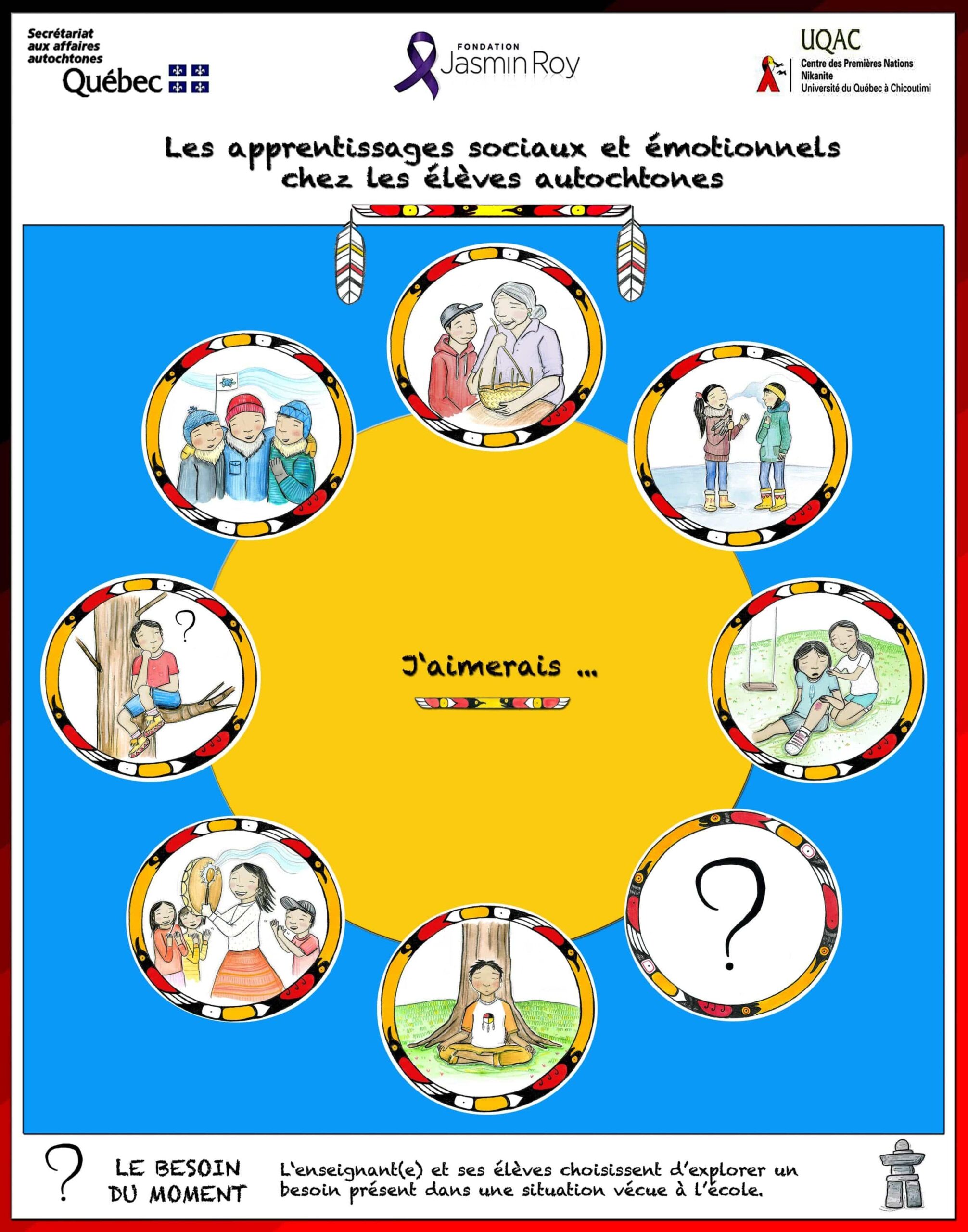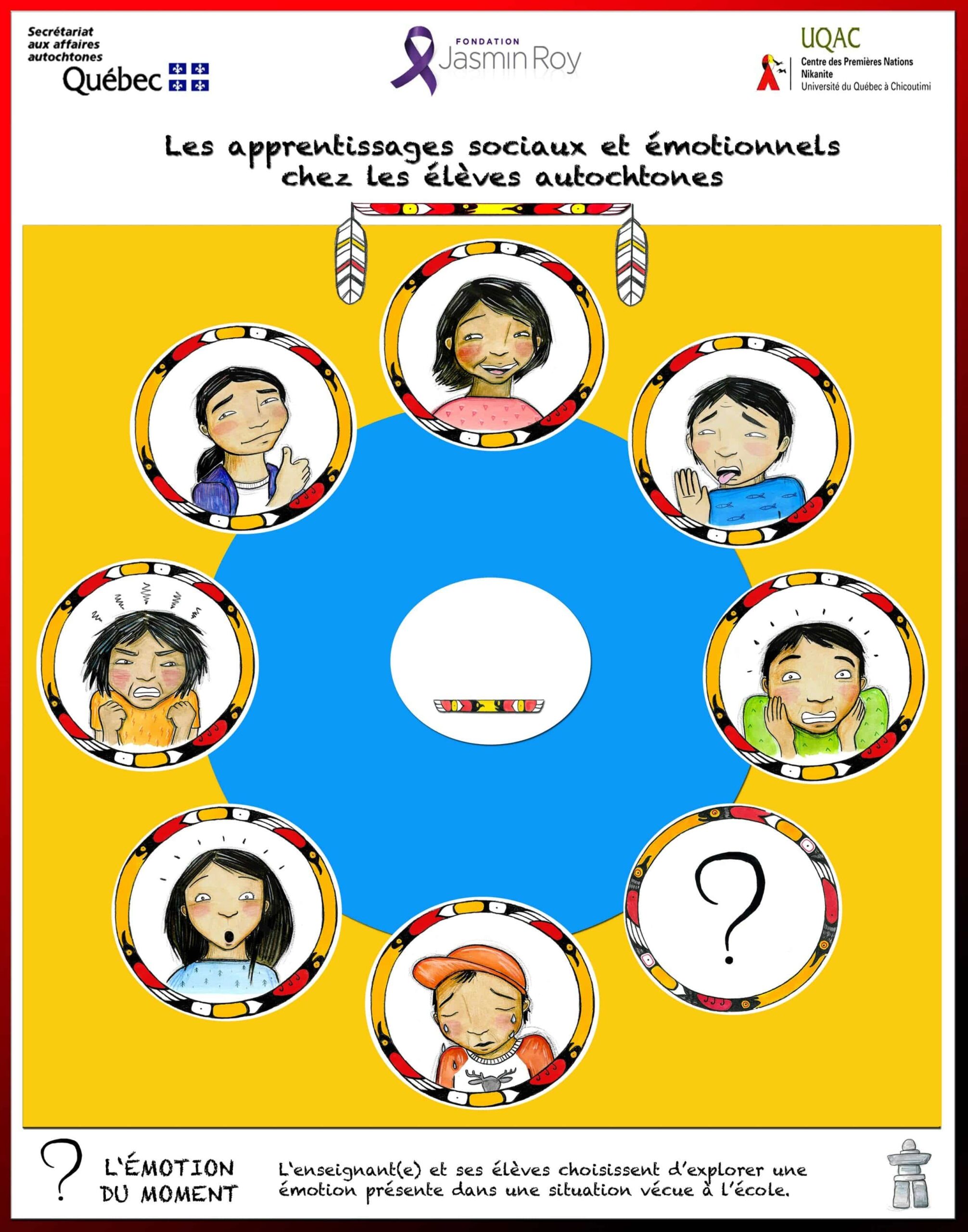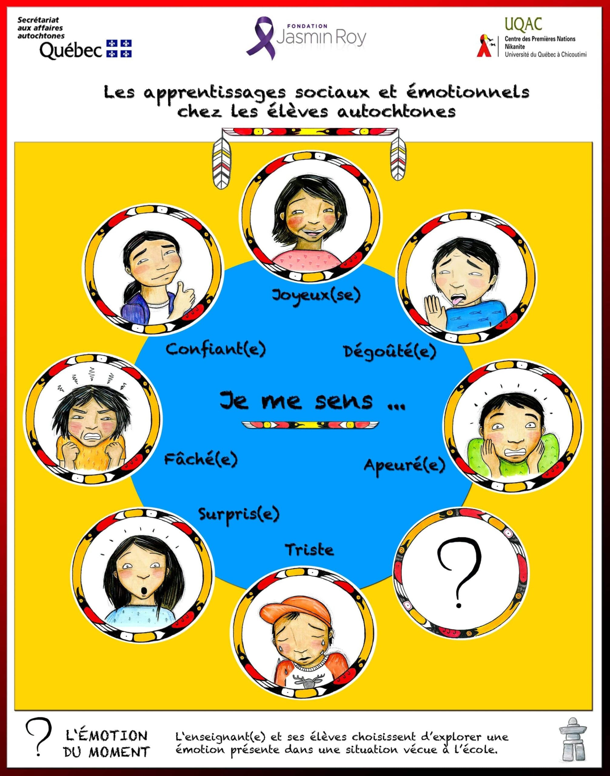 Enseigner aux enfants à exprimer leurs émotions est un défi de tous les jours, mais y investir du temps sera bénéfique à long terme puisque cela mène à une amélioration des comportements relationnels, à une diminution du stress psychologique vécu et, par conséquent, à une augmentation de la capacité d’apprendre (Taylor et coll., 2017). Enfin, Blanchet (2019, p. 26) ajoute que « les valeurs d’empathie et de respect promues par les [apprentissages sociaux et émotionnels] correspondent également aux préceptes d’une éducation à la paix ancrée dans le patrimoine culturel immatériel autochtone (UNESCO, 2014) ». La Fondation Jasmin Roy a développé, en collaboration avec le Centre des Premières Nations Nikanite de l’UQAC, un outil pédagogique à l’intention du personnel éducateur qui souhaite favoriser les apprentissages